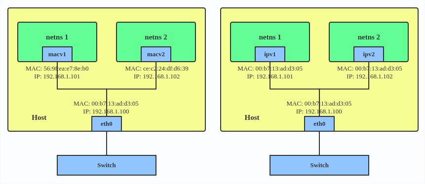 IPVLAN与 MACVLAN类似, 区别在于 IPVLAN各端点的MAC地址是相同的,与其parent设备一致。
