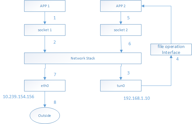 - tun0收到数据包之后,发现另一端被进程APP 2打开了,于是将数据包发给了APP 2