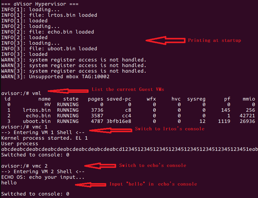The above demo will run 4 Guest VMs on the Hypervisor. After startup, press Enter to go to the hypervisor’s console.