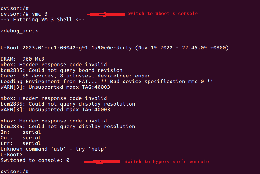 vmc <vm id> // Switch from the hypervisor's console to a Guest VM's console