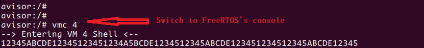 - FreeRTOS: The FreeRTOS VM runs two tasks, one prints “12345” and the other prints “ABCDE”. The tasks are scheduled by FreeRTOS.