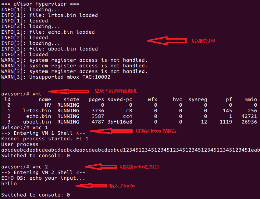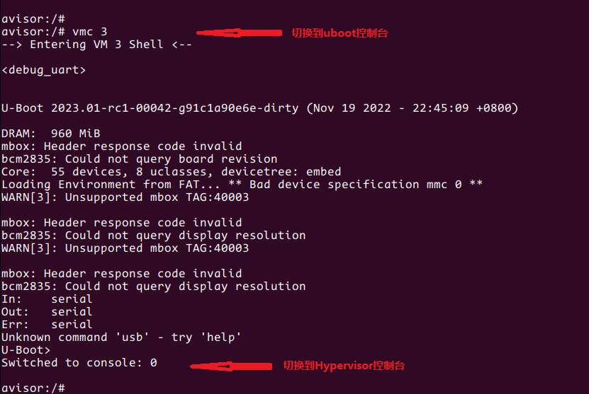 vmc <vm id> // 从Hypervisor控制台切换到VM控制台,例如:vmc 3,切换到uboot控制台